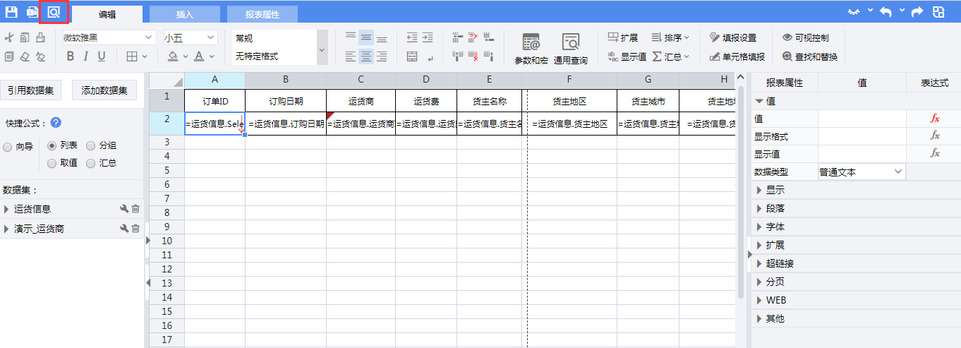 在上节设计的网格式报表示例“运货信息表”中,运货商C2单元格是用数值(运货商ID)显示的,为了增加报表可读性,我们可以在此表的基础上增加显示值设置,将运货商ID显示为对应的运货商姓名,使报表的可读性更强。