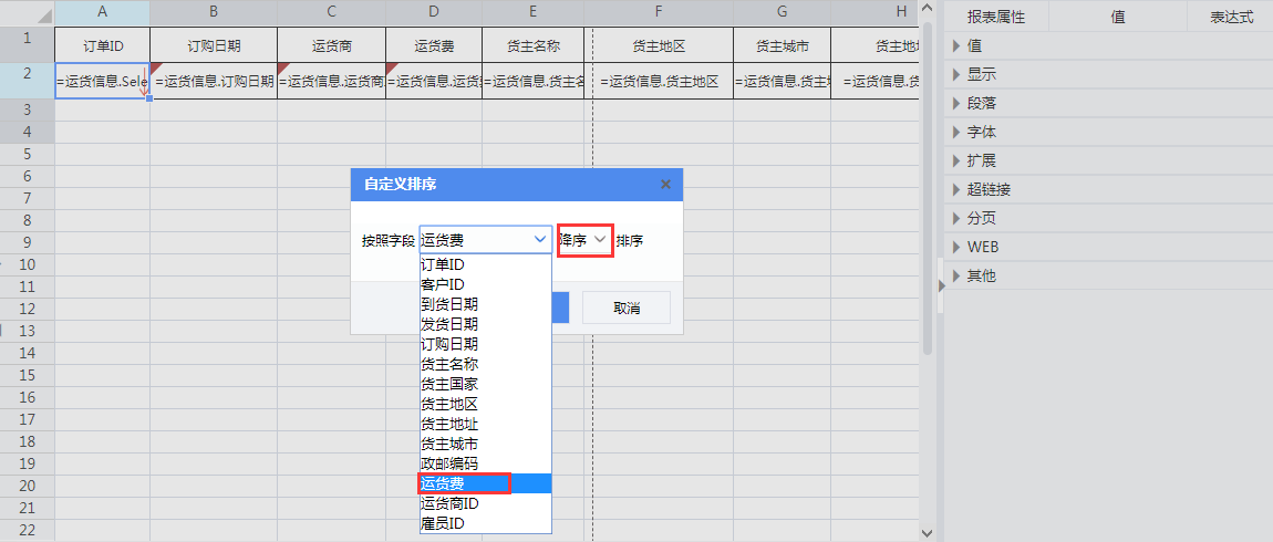 说明:此排序功能的原理是通过设置select或者group函数的参数来实现排序。对于熟悉函数用法的用户也可直接修改A2单元格表达式为: =运货信息.Select(订单ID,true,,运货费)。