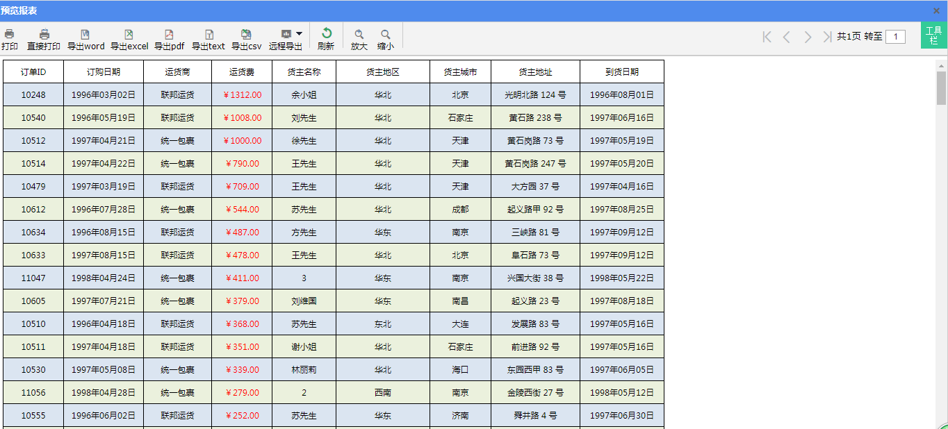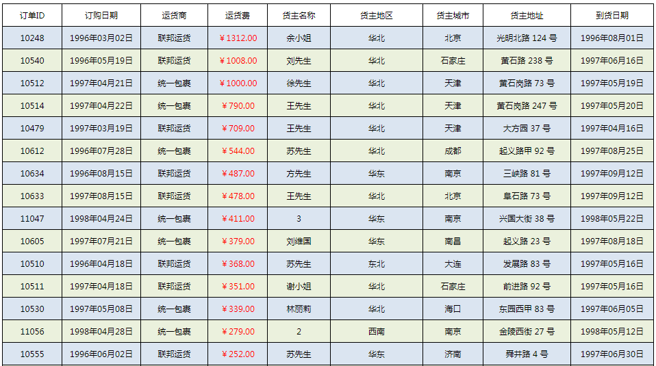 报表展示时,往往要求记录按照一定的顺序进行排列。例如,上节中的“运货信息表5”按运货费降序排列,效果如下图所示:
