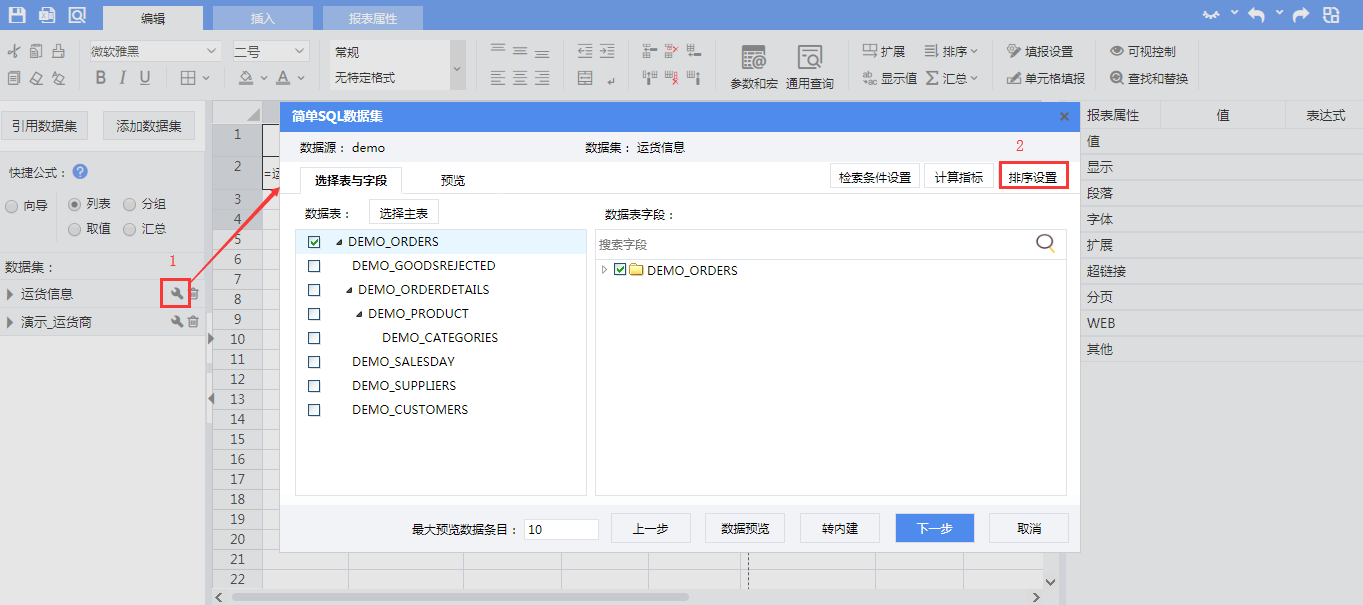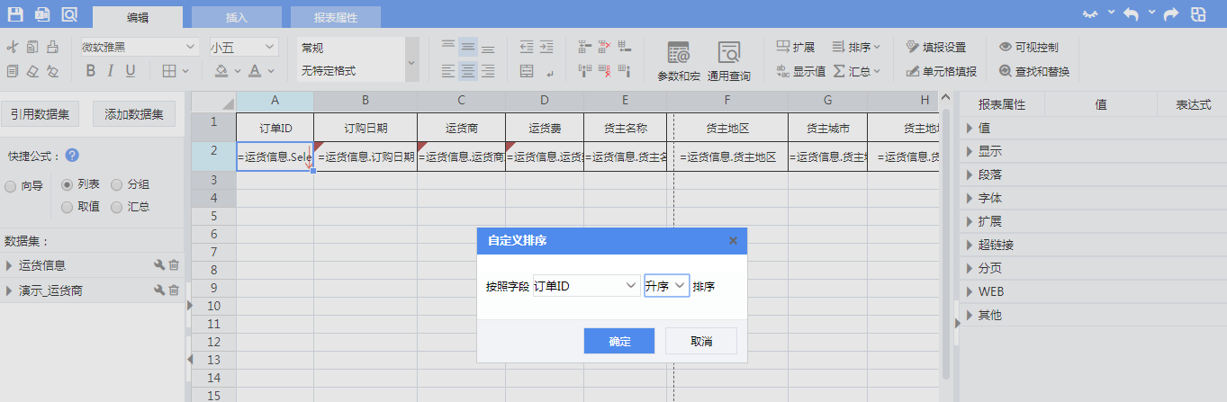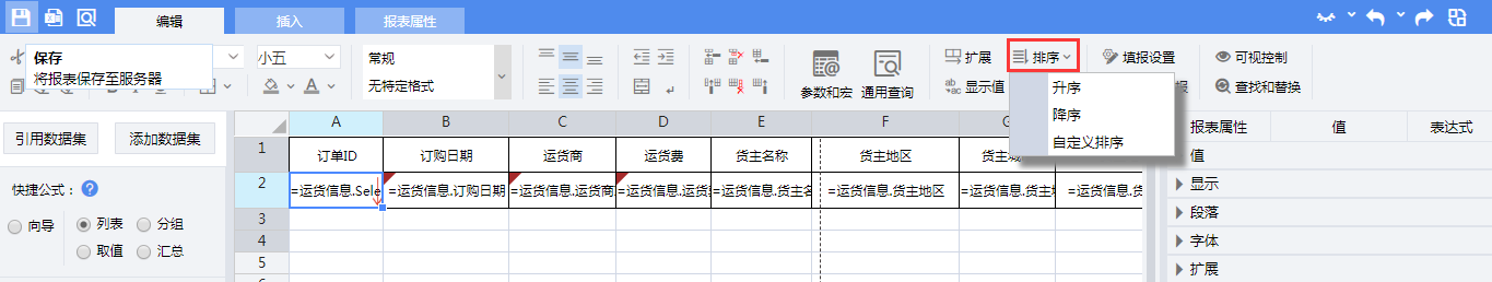 在数据集面板中,找到“运货信息”数据集,点击修改按钮进入修改页面。然后点击右上角的【排序设置】按钮进入排序设置页面。