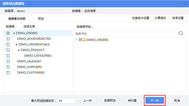 点击【下一步】切换到预览页面,该页面可以查看SQL语句,点击【确定】按钮,数据集修改完成。