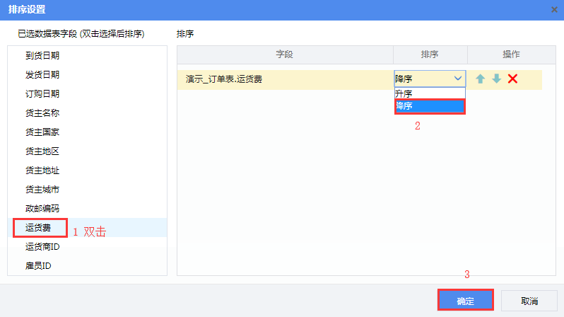 在左侧数据表字段列表里双击“运货费”,使“运货费”添加到右侧排序列表中。然后选择降序,点击【确定】,排序设置完成。