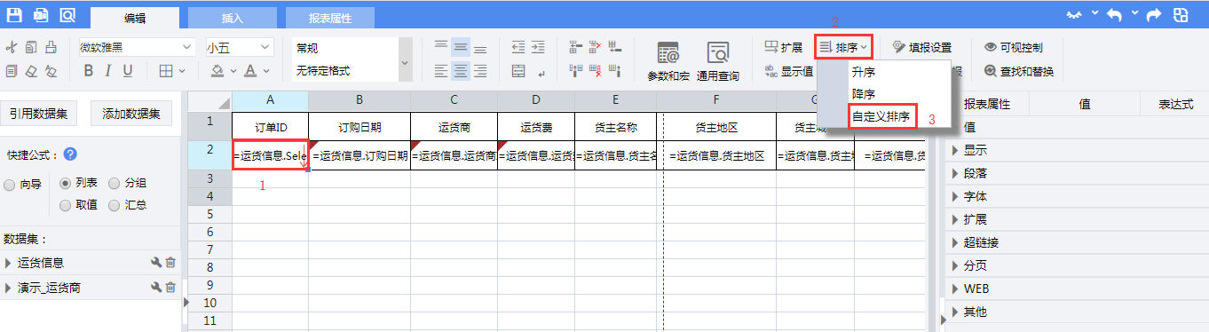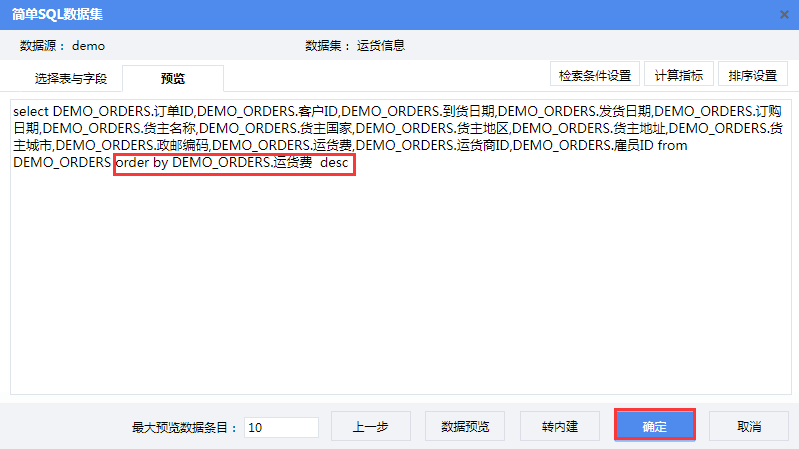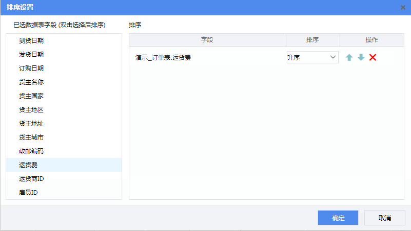 复杂SQL数据集直接通过 SQL 语句进行排序即可。如数据集 SQL 语句为:SELECT * FROM demo_orders order by 运货费 desc 。