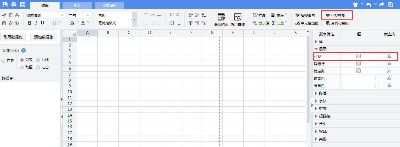 显示中的可视: 选中某单元格时时可设置。 仅勾选可视,代表当前行的内容正常显示;不勾选,代表当前行的内容被隐藏(显示为内容为空的表格);很多时候,我们需要设定在满足某一条件时显示,不满足某一条件时不显示。这时,可在表达式中编辑条件表达式,表达式执行结果为true的条件正常显示,false时内容均被隐藏(显示为内容为空的表格)。