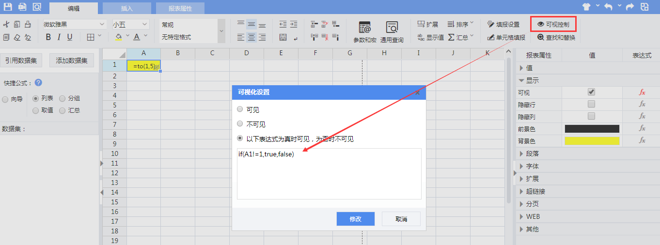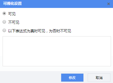 编辑中的可视控制:选中某单元格时可设置。可使用多种设置方式,当单元格的条件执行结果为true或可见时,代表当前单元格内容正常显示;当单元格的条件执行结果为fasle或不可见时,代表当前单元格内容被隐藏(显示为内容为空的表格)。