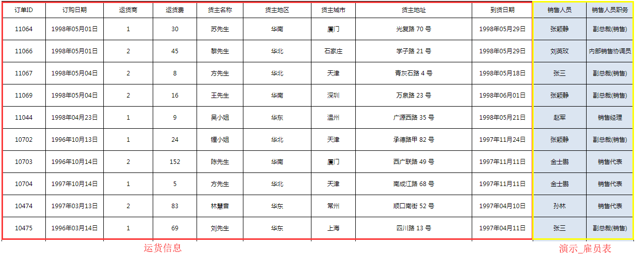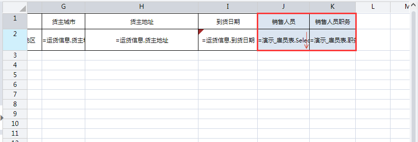J2单元格表达式为:=演示 _ 雇员表.Select(销售人员,false,演示 _ 雇员表.雇员ID==运货信息.雇员ID),它的结果是数据集“演示 _ 雇员表”中字段”销售人员”对应的雇员ID与数据集中“运货信息”雇员ID相对应的所有值,由于这时返回的记录只有一条,所以不会扩展。