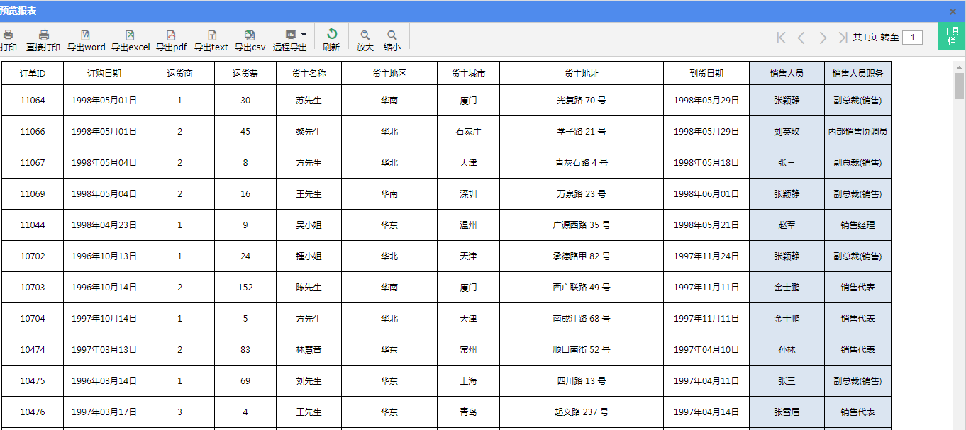 点击设计界面左上角的预览按钮对报表模板进行查看。预览效果如下图: