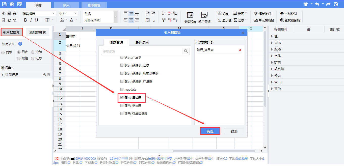 点击【引入数据集】按钮,在引入数据集页面,找到并勾选数据集“演示 _ 雇员表”,点击【选择】按钮。