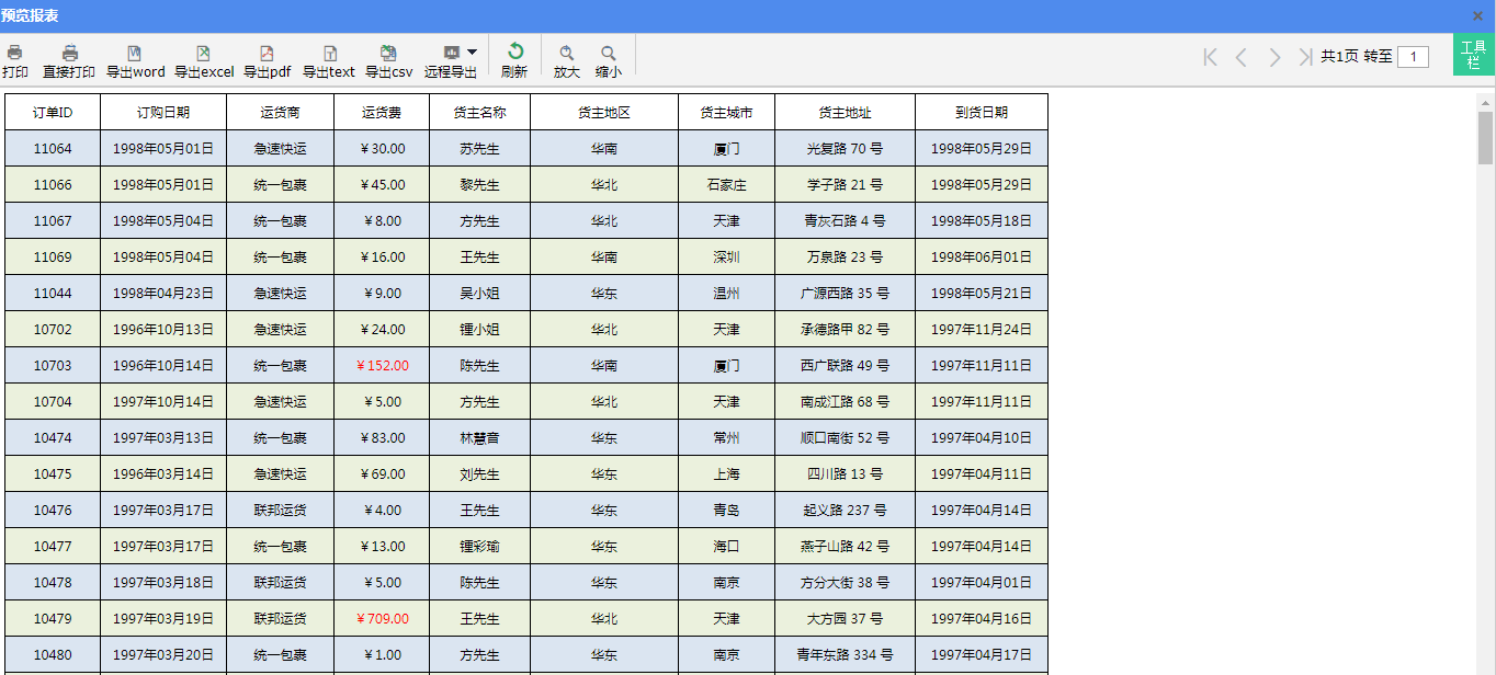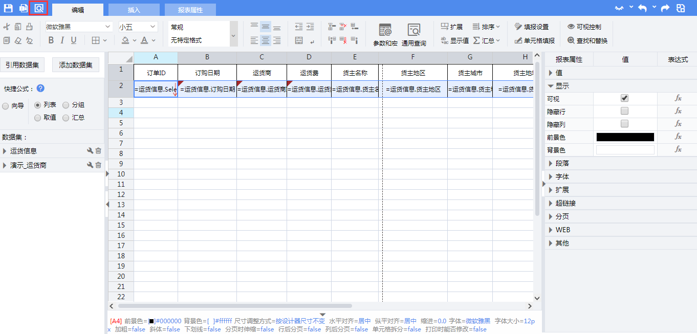 点击设计界面左上角的预览按钮对报表模板进行查看。