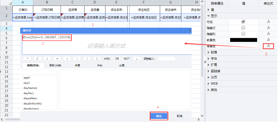 选中A2~I2单元格,右侧属性栏,选择【显示】—【背景色】,点击输入框后的表达式按钮,在弹出的表达式编辑窗口,输入表达式:if(row()%2==0,-2365967,-1314339),点击【确定】,设置完成。如下图所示: