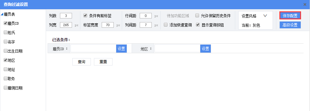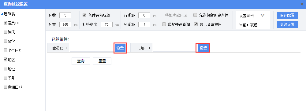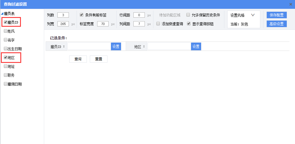 在左侧勾选需要做查询的字段“雇员ID”和“地区”。