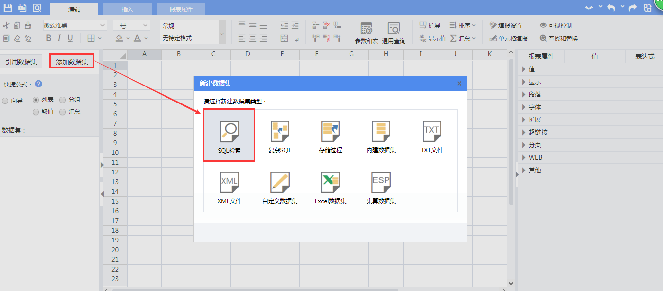 点击【添加数据集】按钮,在新建数据集页面选择【SQL检索】