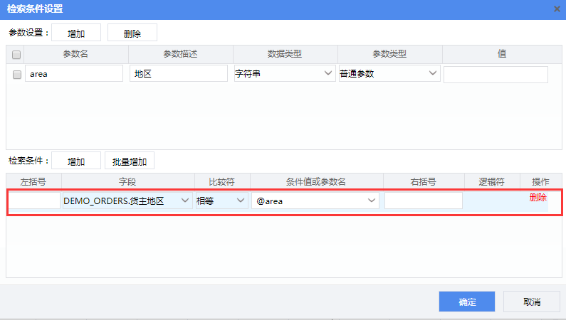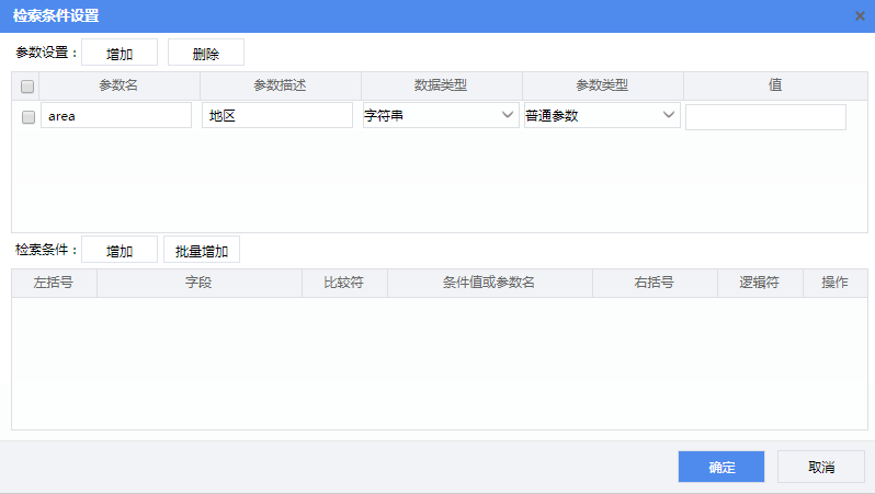在SQL检索数据集中,【检索条件设置】tab页中可以进行参数设置,如下图所示:
