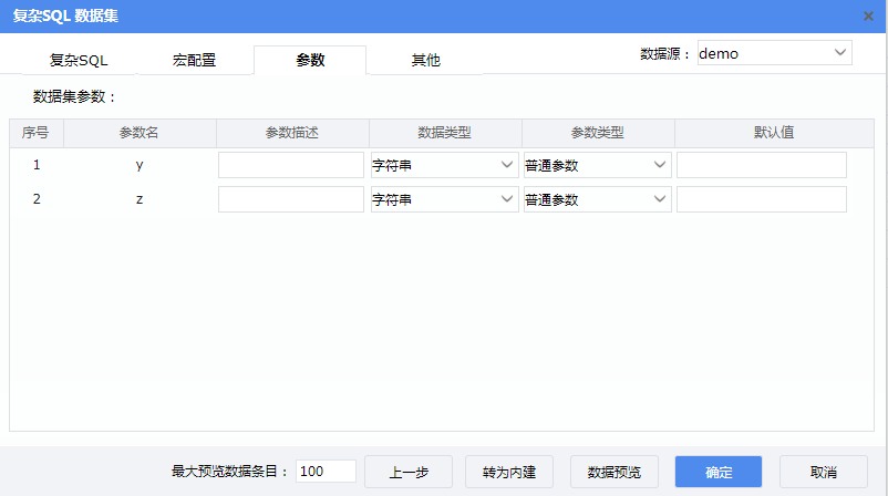 然后可以在参数页面进行参数的具体属性设置,进而实现数据集可分别接受y和z对应的参数值实现过滤。