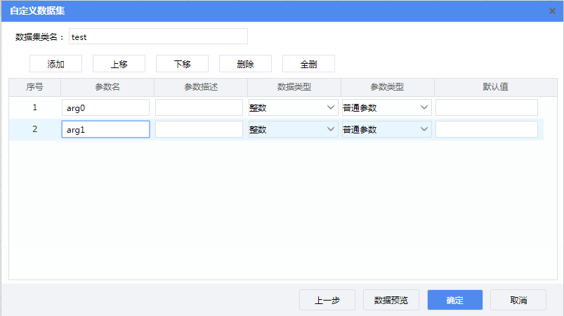 对于存储过程、自定义等其它类型的数据集,可以直接在数据集定义界面中通过增加按钮来添加数据集参数。例如下图所示的自定义类型数据集: