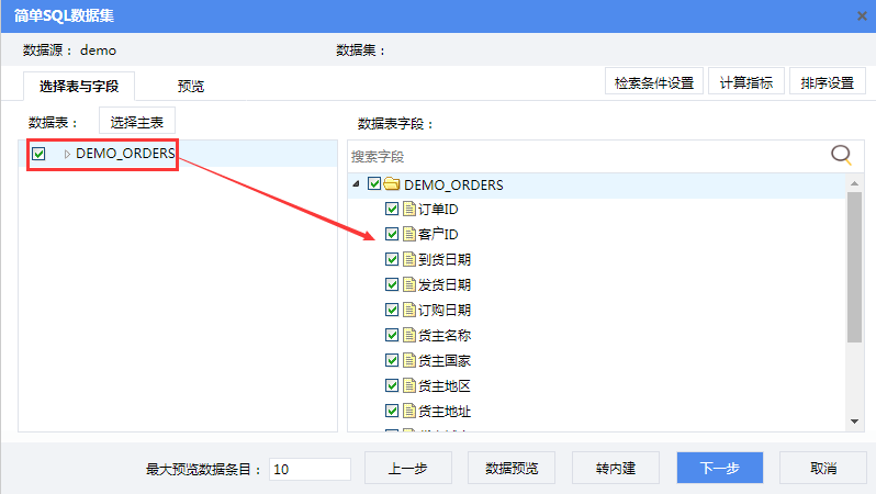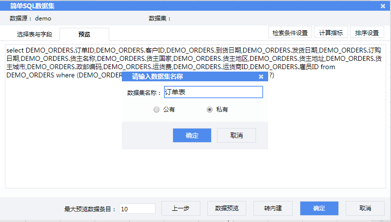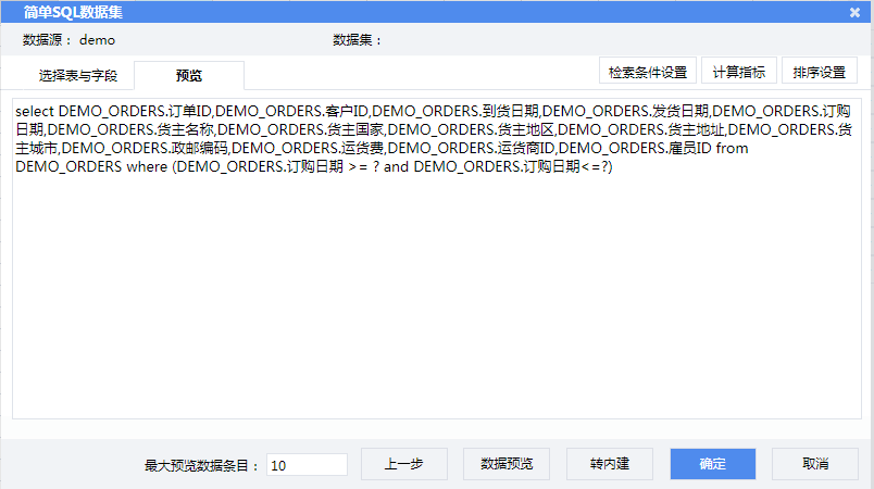 报表中的数据来自产品中自带的演示数据表“演示_订单表”,采用sql检索数据集并对字段“订购日期”设置了应用参数进行数据过滤的检索条件。