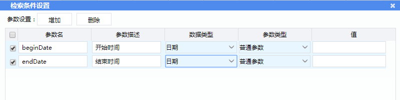 3)切换至【检索条件设置】tab页,点击参数设置后的【增加】按钮,添加两个参数 “beginDate”和“endDate”。