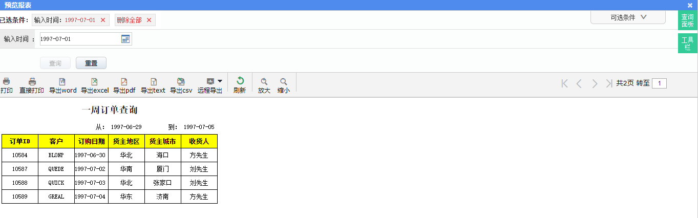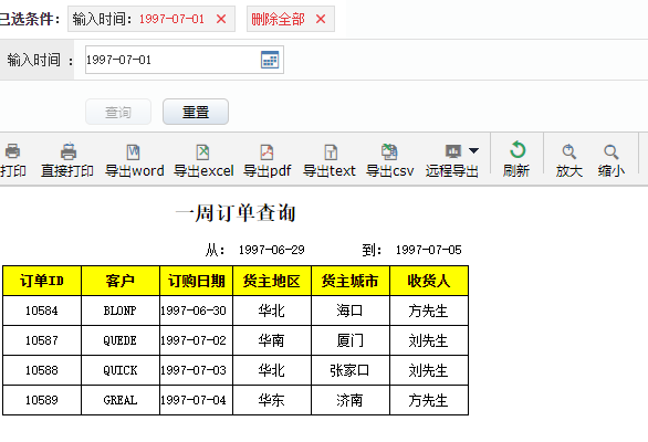 在预览界面的查询条件处输入日期,点击查询按钮即可查出这一周的订单,如下图: