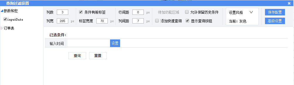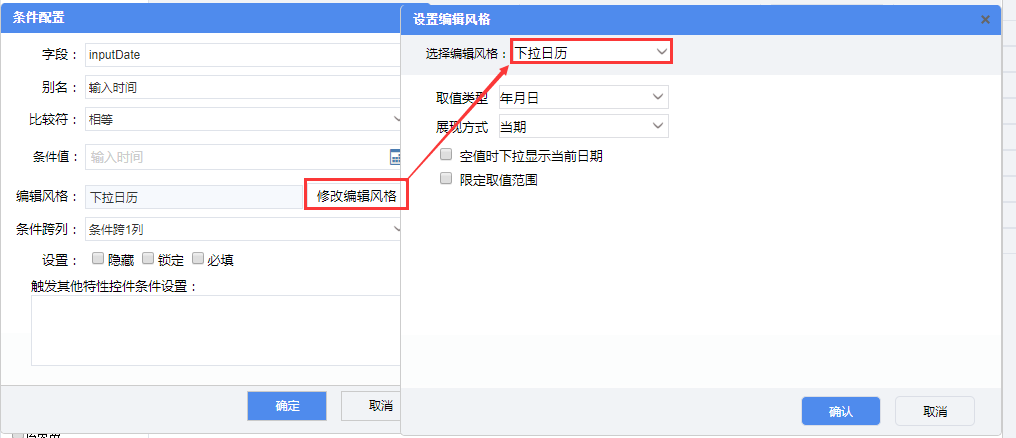 点击查询条件后的【配置】按钮,打开条件配置页面,设置编辑风格为【下拉日历】。
