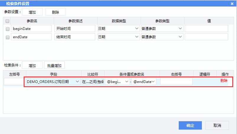 点击检索条件后的【增加】按钮,添加过滤条件 订购日期 在 @beginDate 和 @endDate 之间(包含),点击【确定】按钮回到【选择表与字段】tab页。
