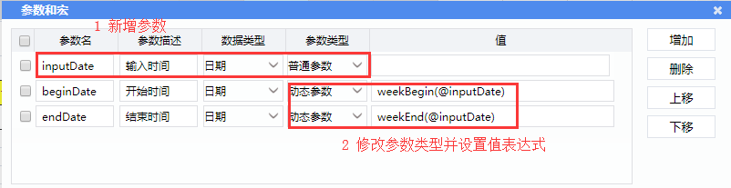 打开菜单栏的【编辑】—【参数和宏】页面,先新增一个名称为“inputDate”的日期型普通参数,用于接收传入的查询日期,然后将自动添加到参数页面的“beginDate”、“endDate”两个参数的类型修改为“动态参数”,并设置默认值表达式。