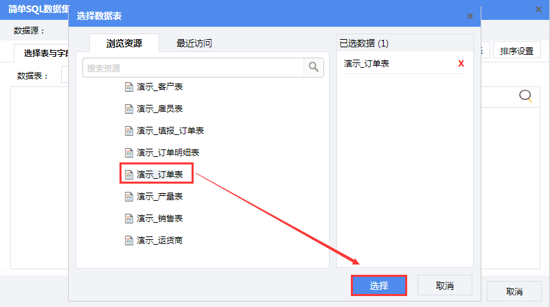 1)点击【添加数据集】按钮,在新建数据集页面选择【SQL检索】,找到数据表“演示_订单表”,点击【选择】。