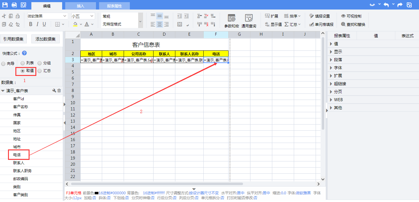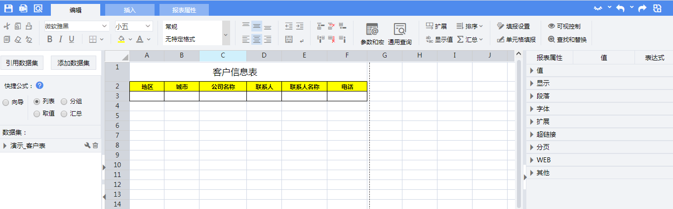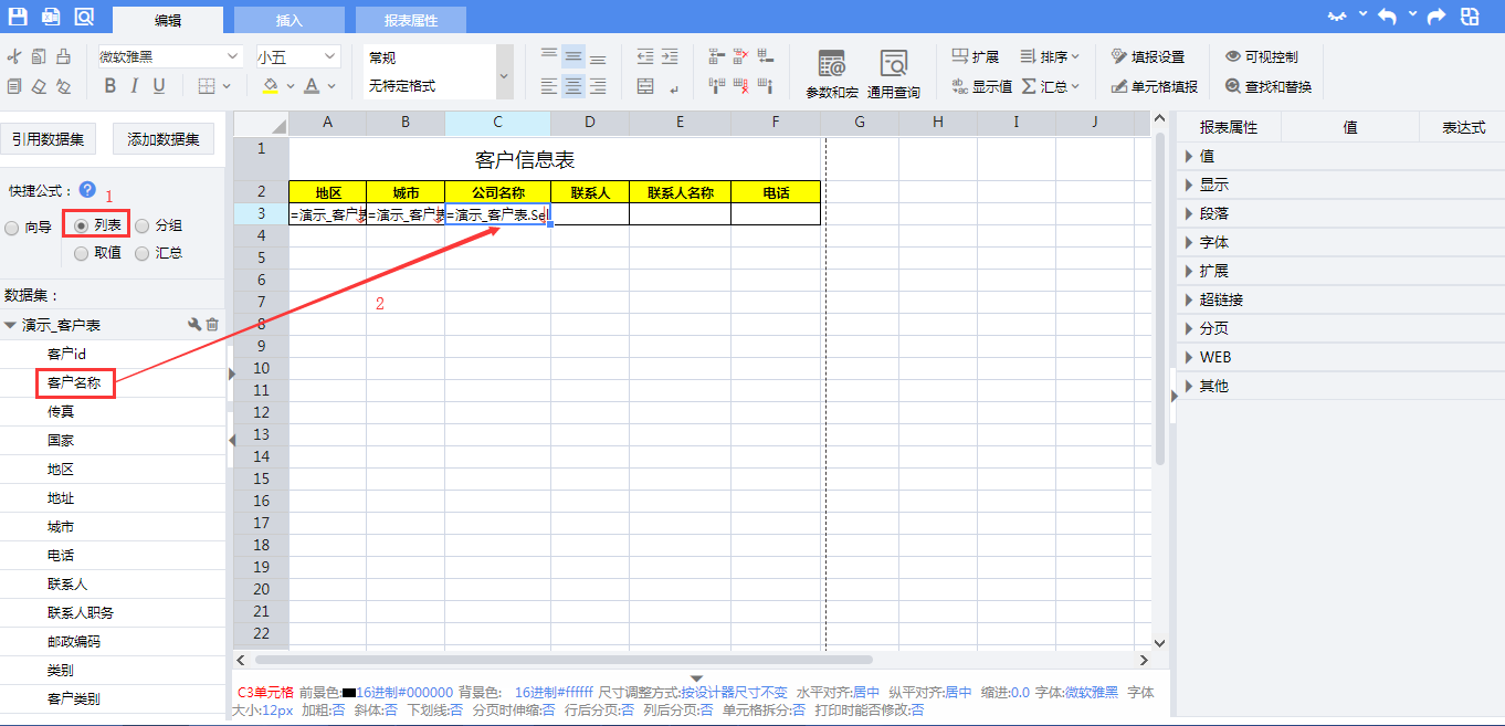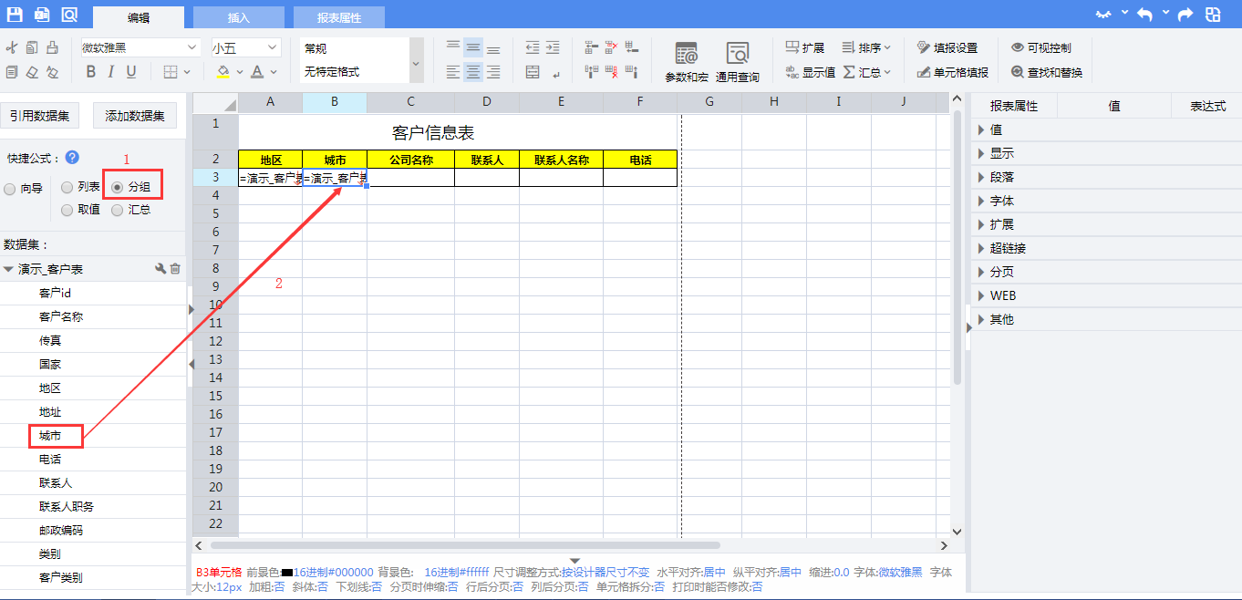 =演示_客户表.Group(地区,false)B3:=演示_客户表.Group(城市,false)C3:=演示_客户表.Select(客户名称)D3:=演示_客户表.联系人E3:=演示_客户表.联系人职务F3:=演示_客户表.电话