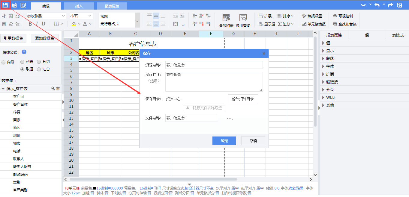 点击设计界面左上角的保存按钮对报表模板进行保存。