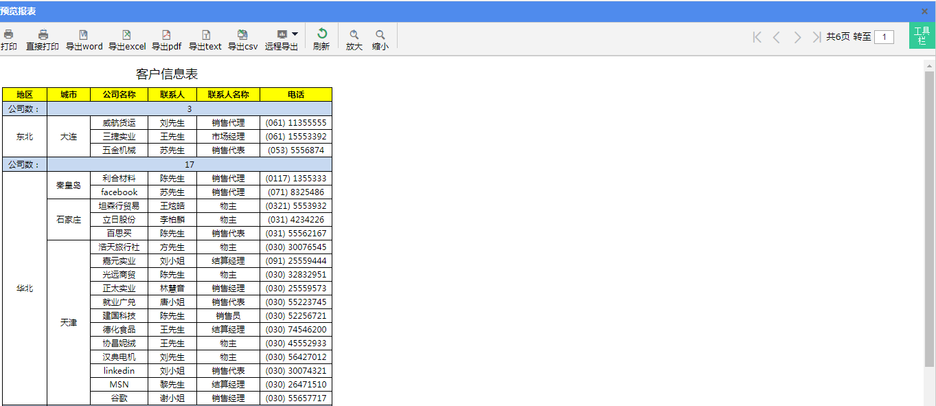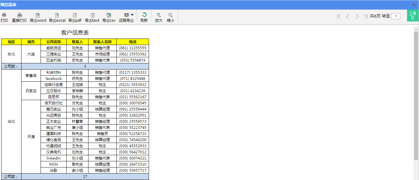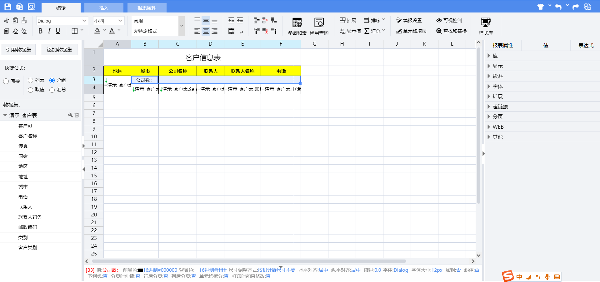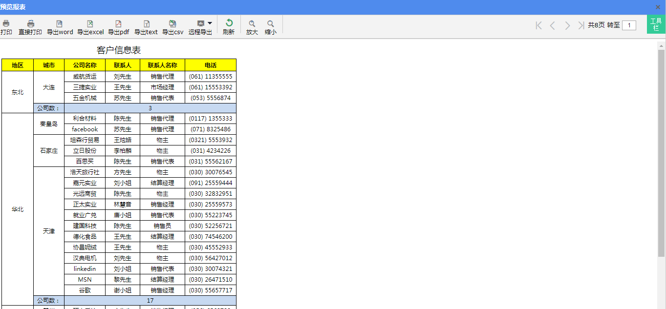 在分组报表中,经常需要对分组数据进行汇总求和、计数等统计运算,例如下图所示的分组报表,汇总统计了每个地区分组下的客户公司数量: