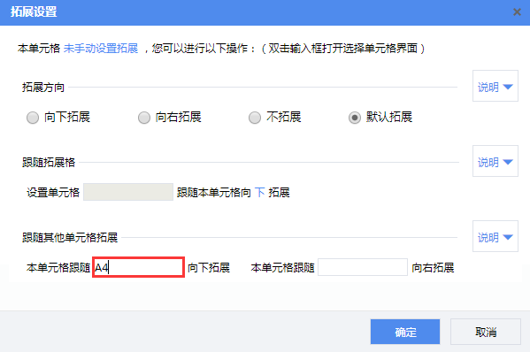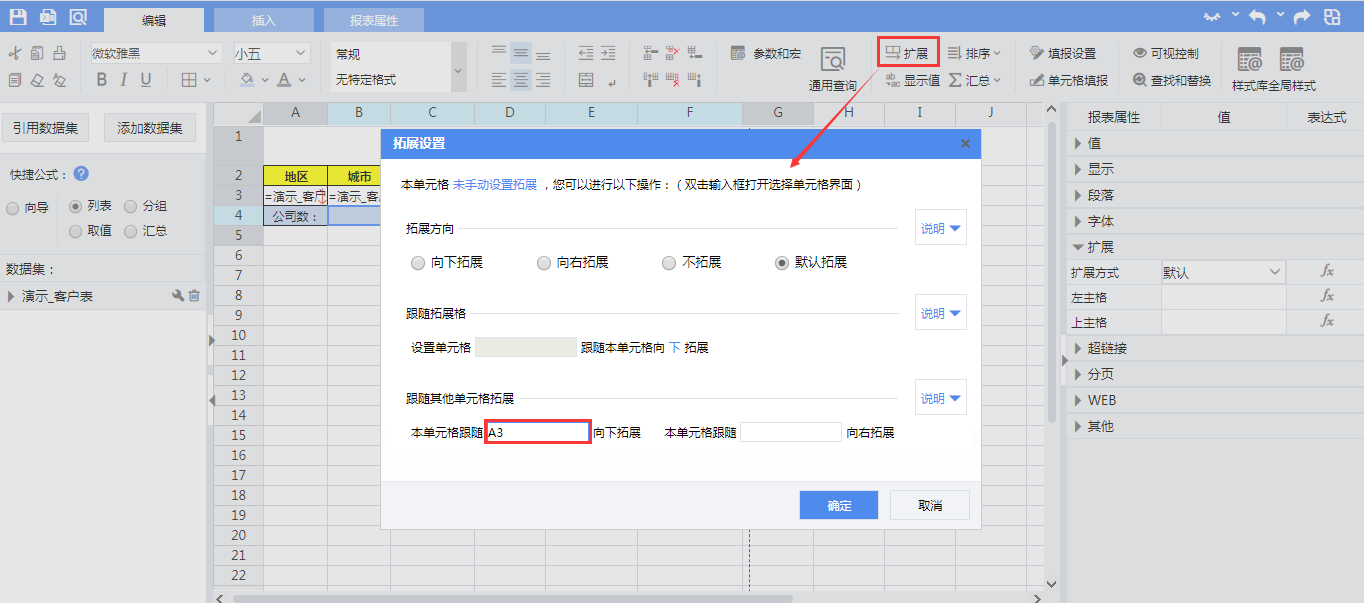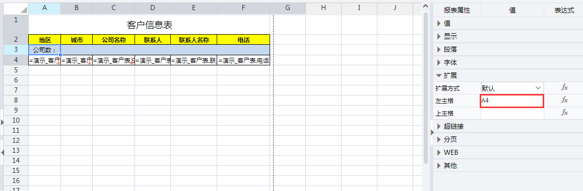 选中单元格A3,然后使用设计器工具栏的【编辑】—【扩展】菜单,设置单元格A3跟随A4向下扩展。
