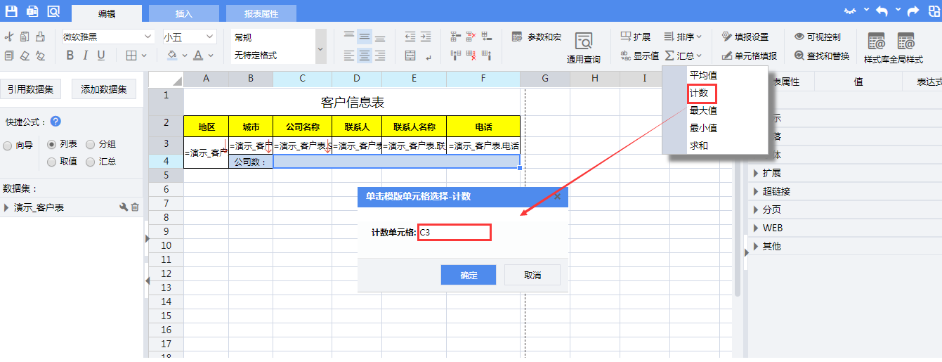选中单元格C3,使用设计器工具栏【汇总】菜单中的【计数】运算向单元格C3插入汇总计算公式: