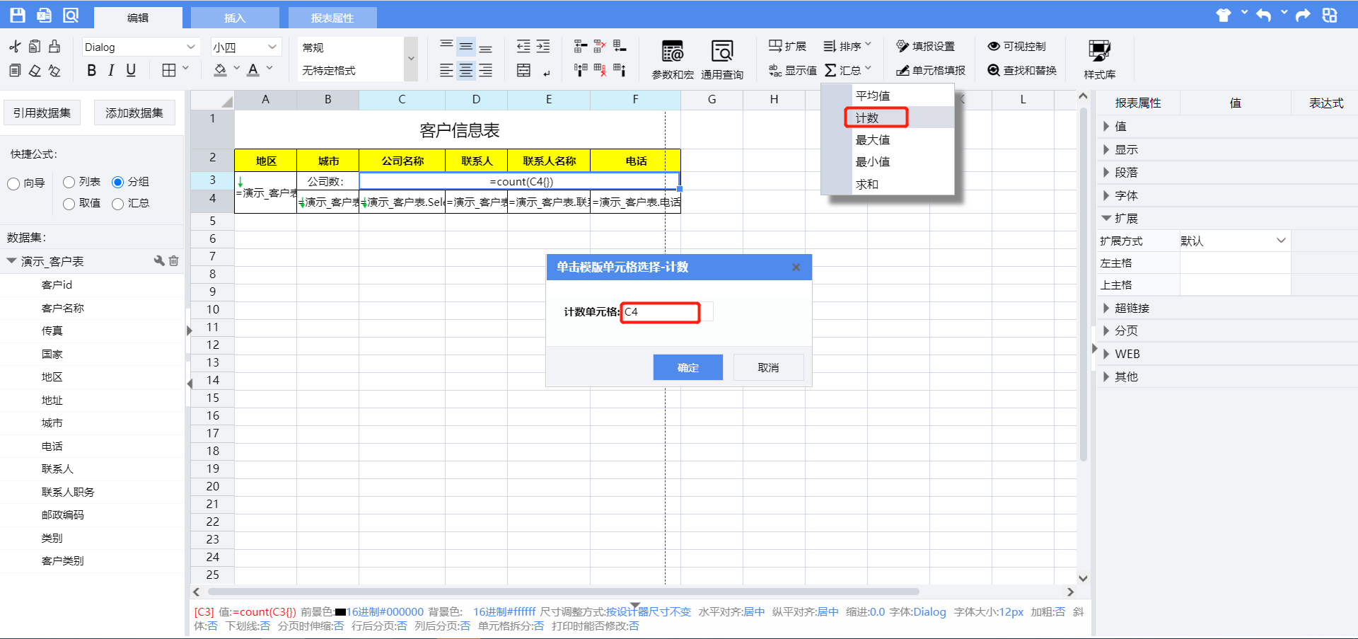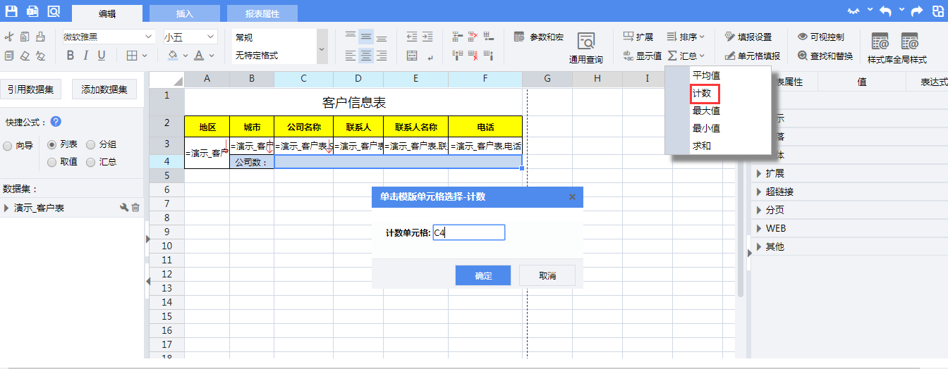 选中单元格C4,使用设计器工具栏【汇总】菜单中的【计数】运算向单元格C4插入汇总计算公式:
