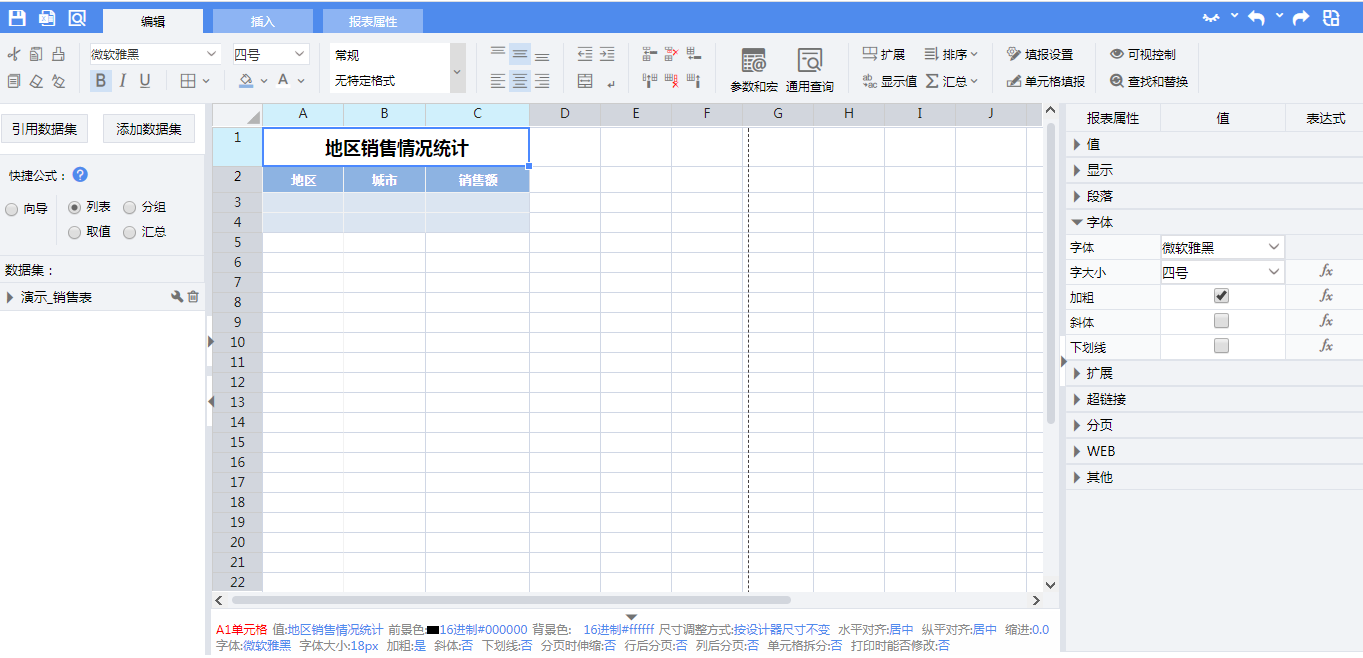 =demo_sales.Group(地区,false,地区=="华北" or 地区=="华东" ,,,)B3:=demo_sales.Group(城市,false)C3:=demo_sales.Sum(销售金额)B4:=demo_sales.Group(城市,false,地区<>"华北" and 地区<>"华东" ,,,)C4:=demo_sales.Sum(销售金额)