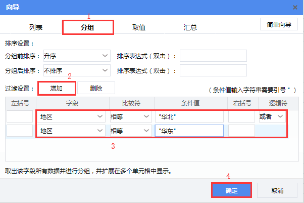 选择【分组】tab页,点击【过滤设置】后的【增加】按钮添加两个过滤条件并设置地区 等于 “华北” 或者 地区 等于 “华东”,然后点击【确定】。如下图所示: