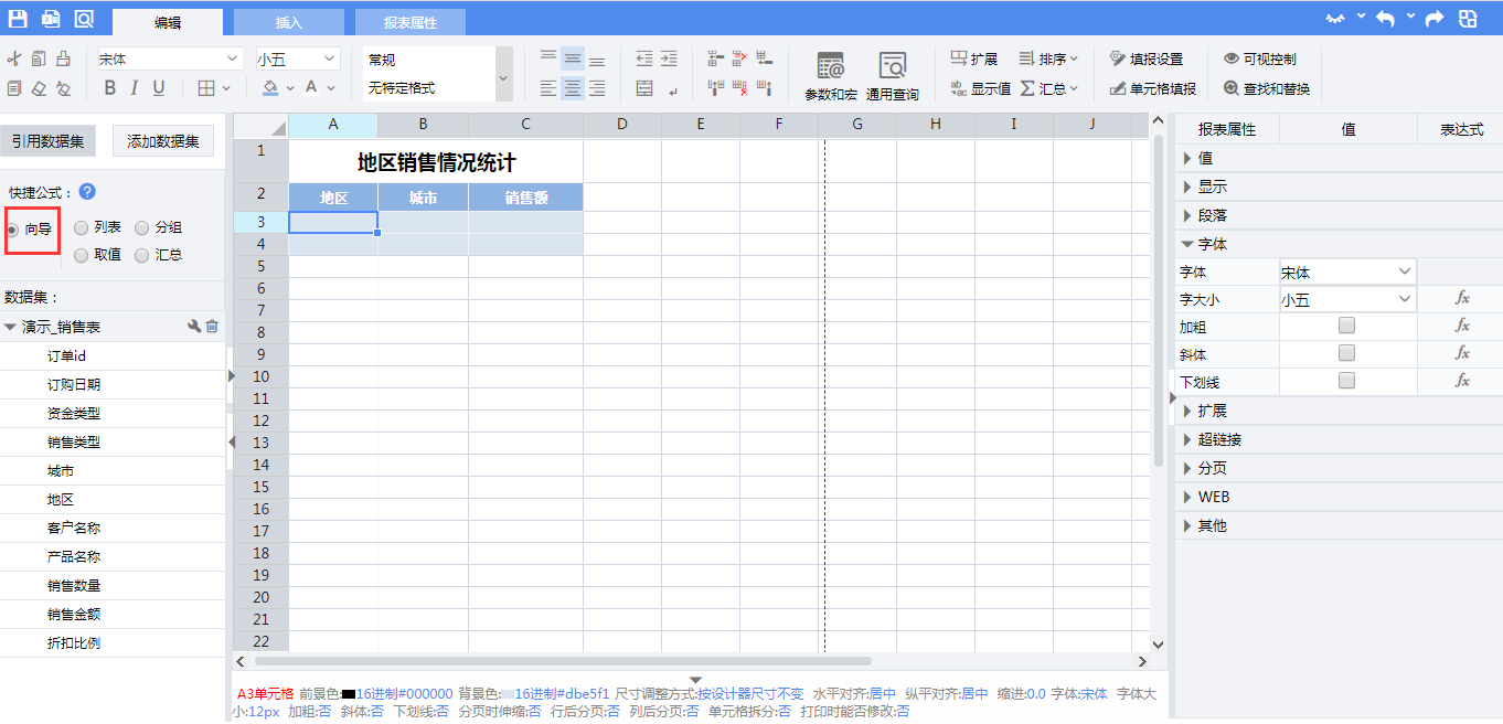 使用单元格向导,可以轻松实现这张不完全分组报表。选择【向导】,然后将字段拖拽至相应单元格,并在单元格向导页面做相应过滤设置,具体操作如下: