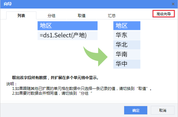 1)将“地区”字段拖拽至A3单元格,在弹出的单元格向导页面,点击右上角的【高级向导】切换至高级向导页面,