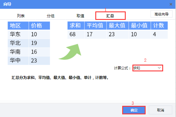 3)将字段“销售金额”拖拽至C3单元格。在弹出的单元格向导页面选择【汇总】,计算公式选择“求和”,点击【确定】。