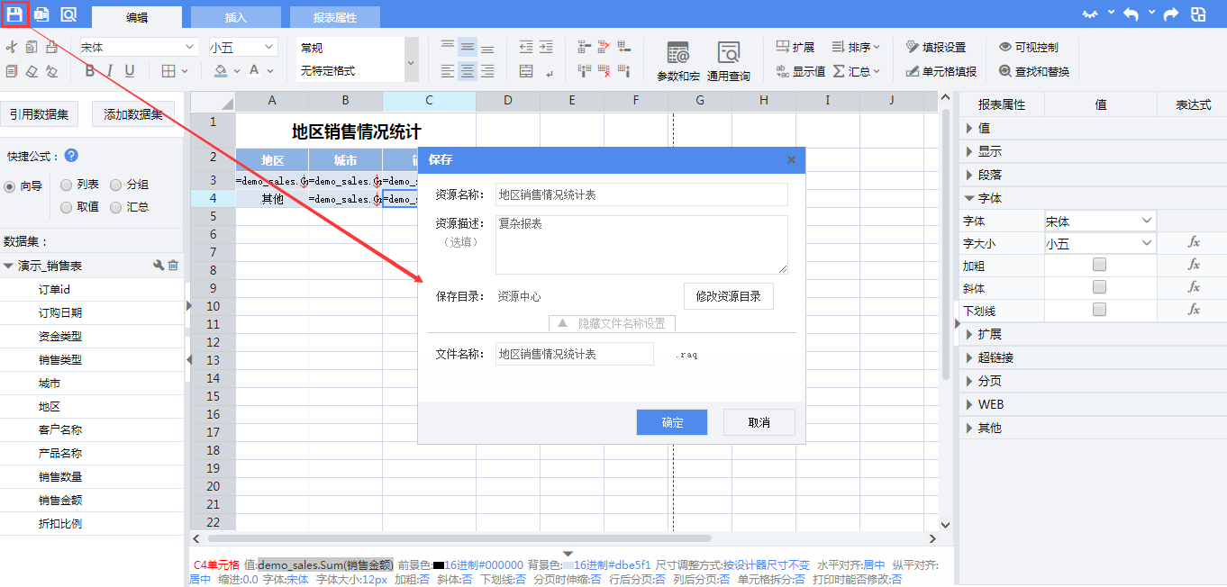 点击设计界面左上角的保存按钮对报表模板进行保存。