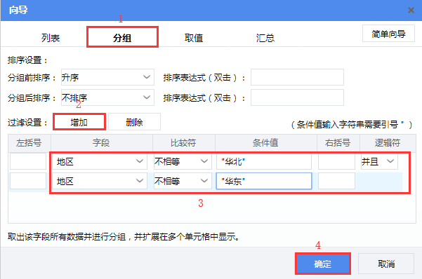 4)将“城市”字段拖拽至B4单元格,在弹出的单元格向导页面,点击右上角的【高级向导】切换至高级向导页面,选择【分组】tab页,点击【过滤设置】后的【增加】按钮添加两个过滤条件并设置地区 不等于 “华北” 并且 地区 不等于 “华东”,然后点击【确定】。如下图所示: