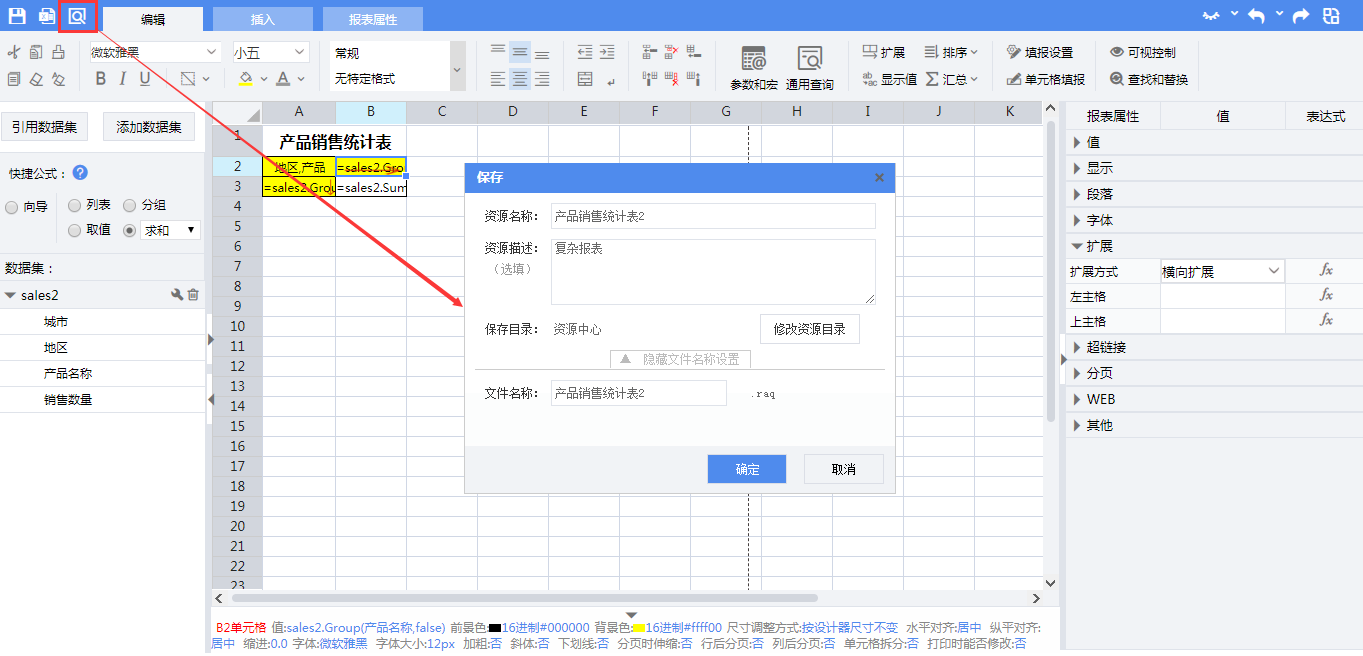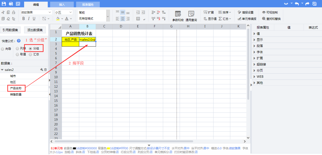 1)使用单元格快捷公式向导中的【分组】,将数据集字段“产品名称”拖入B2单元格。