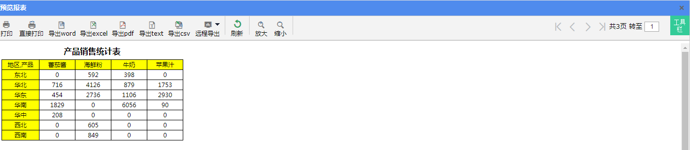 - 报表的行、列表头数据均是从数据集中动态获取,例如本示例报表中行表头按字段“地区”纵向分组,列表头按字段“产品名称”横向分组。