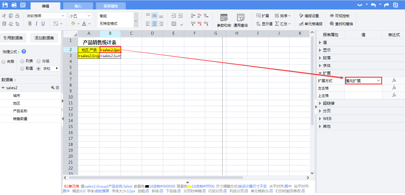 选中B2单元格,在右侧属性栏【扩展】中,设置【扩展方式】为“横向扩展”。