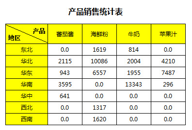 - 报表行、列表头交叉区域的单元格统计出对应地区、产品下的销售金额。