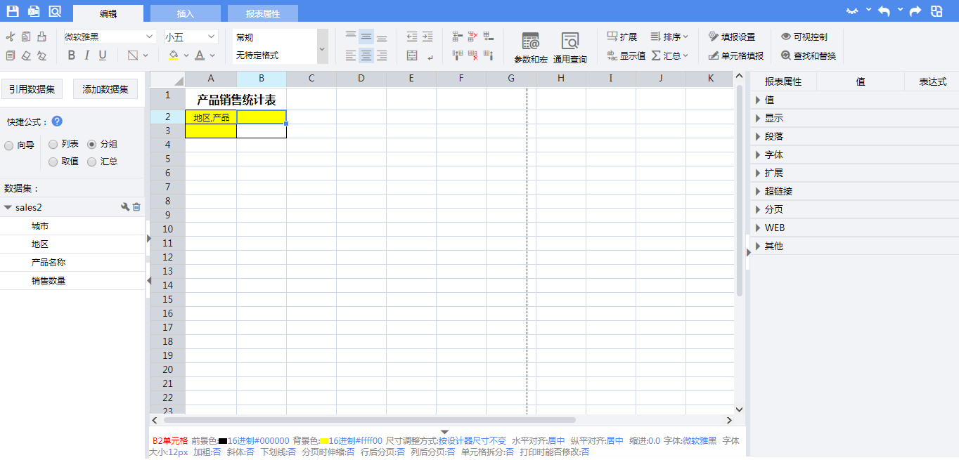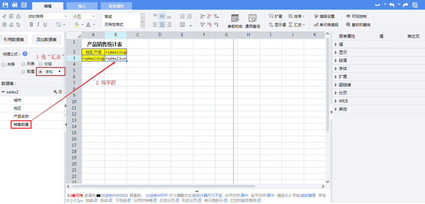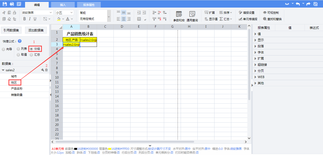 =sales2.Group(产品名称,false)A3:=sales2.Group(地区,false)B3:=sales2.Sum(销售数量)