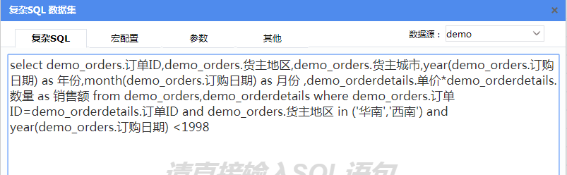 报表中的数据来自产品自带演示数据库中的“演示订单表”和“演示订单明细表”,使用复杂sql数据集建立数据集ds1,数据集sql语法如下:select demo_orders.订单ID,demo_orders.货主地区,demo_orders.货主城市,year(demo_orders.订购日期) as 年份,month(demo_orders.订购日期) as 月份 ,demo_orderdetails.单价*demo_orderdetails.数量 as 销售额 from demo_orders,demo_orderdetails where demo_orders.订单ID=demo_orderdetails.订单ID and demo_orders.货主地区 in (‘华南’,’西南’) and year(demo_orders.订购日期) <1998