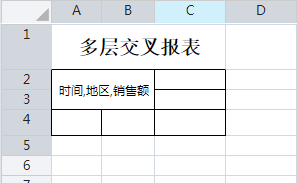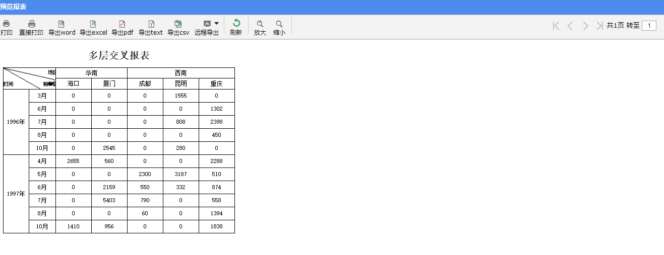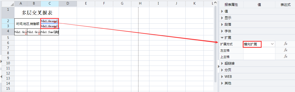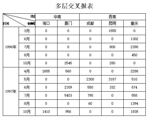 - 交叉报表的行表头或者列表头存在多层扩展,例如本示例报表中,行表头有年、月两层分组扩展,列表头有地区、城市两层分组扩展