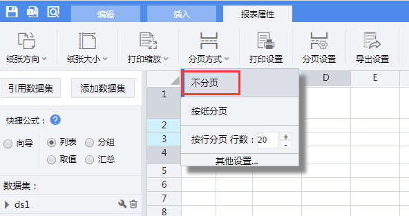 点击【报表属性】的【分页方式】,设置为“不分页”。