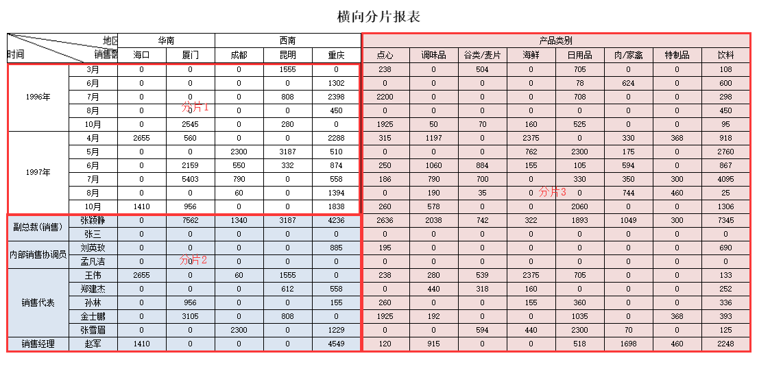 报表纵向、横向均有分片区域,例如上图的示例报表中,除了纵向的上下两处分片区域,横向上也出现了左右两片区域。