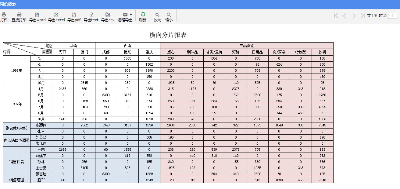 在之前已经学习的报表示例【纵向分片报表】的基础上,在报表右侧增加一个横向扩展格,预览效果如下图所示: