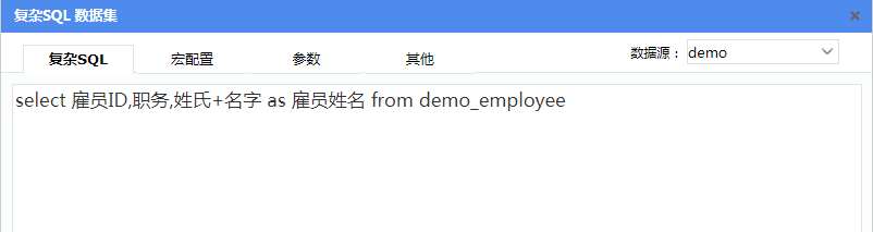 第二个数据集ds2从产品自带演示数据库中的“演示_雇员表”取数,与报表示例【分片报表】中相同,数据集sql语法如下: